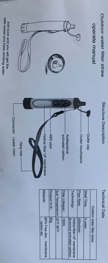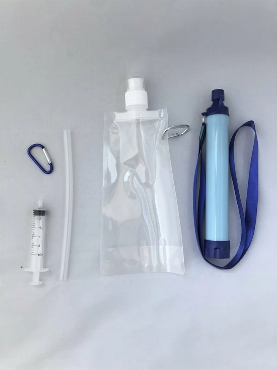 Daarnaast bevat de set een waterzak van 450ml die je kunt gebruiken als je geen waterfles bij je hebt of mee wilt nemen. Zorg er wel voor dat er geen grote stukken in het ongefilterde water zitten. Zo raakt het filter verstopt en kun je er niet meer optimaal gebruik van maken.