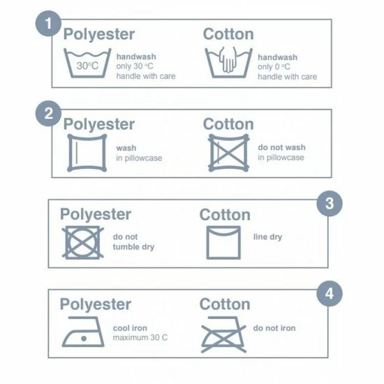 De ophangring springt vanzelf in zijn vorm. In kussensloop te wassen op 30 graden, niet centrifugeren en strijken, maar uithangen om te drogen.