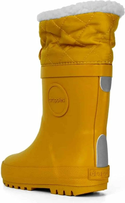 Trendy en stoere regenlaarsjes van Druppies in de vrolijke kleur okergeel. Deze regenlaarsjes zijn handgemaakt van 100% natuurrubber waardoor ze een soepele en perfecte pasvorm hebben. Tevens voorzien van een warme borgvoering voor de koude herfst- en winterdagen. De Druppies regenlaarsjes hebben katoenen voering en een binnenzool die eruit gehaald kan worden. Deze regenlaarsjes zijn in maar liefst vier leuke kleurtjes verkrijgbaar. Ook handig: een handig aantrekkoord zodat je ze gemakkelijk aan kunt trekken en aan de achterzijde voorzien van twee reflectoren. Kenmerken Druppies regenlaarsjes winter winter okergeel: * handgemaakt van 100% natuurrubber * uitneembare binnenzool en katoenen voering * extra dikke zool met grof profiel * twee reflectoren op de achterzijde Naast deze Druppies regenlaarsjes winter winter okergeel kun je bij ons terecht voor alle andere modellen van Druppies (). Natuurlijk baal je wel als het regent buiten maar goed, de zon komt vast weer terug en er zitten ook echt wel voordelen aan een regenbui op zijn tijd. Naast dat het goed is voor de tuin geeft het je ook de gelegenheid om heerlijk met je kind door de plassen te stampen. Kinderen mogen altijd ongestraft stampen in de plassen zonder dat er mensen raar van opkijken. Maar hee, waarom zou je je als volwassene niet eens lekker uit mogen leven op de diepste plassen die je kunt vinden? Gewoon eens doen, kekke regenlaars aan de voet en stampen maar! Hieronder een maattabel om je te helpen de juiste maat te bepalen (let op: de Druppies regenlaarsjes vallen iets groter dan gemiddeld): Maattabel Druppies: * maat 20 = 13,0 cm * maat 21 = 13,6 cm * maat 22 = 14,4 cm * maat 23 = 15,1 cm * maat 24 = 15,7 cm * maat 25 = 16,4 cm * maat 26 = 16,9 cm * maat 27 = 17,5 cm * maat 28 = 18,1 cm * maat 29 = 18,7 cm * maat 30 = 19,5 cm * maat 31 = 20,2 cm * maat 32 = 20,8 cm Over Druppies: Druppies is een jong Nederlands merk dat hippe regenlaarzen fabriceert. De felgekleurde Druppies worden handgemaakt van 100% natuurrubber waardoor de laarsjes een soepele en perfecte pasvorm hebben. De laarzen zijn voorzien van een katoenen binnenvoering en hebben een uitneembare binnenzool. Doordat deze kinderlaarzen net wat lager zijn dan gemiddelde regenlaarzen, kunnen ze ook heel goed als fashion boot gedragen worden. Deze stoere regenlaarsjes onderscheiden zich door hun matte uiterlijk en zijn leverbaar in 7 hippe kleurtjes voor zowel jongens als meisjes. Welke regenlaarsjes kies jij?
