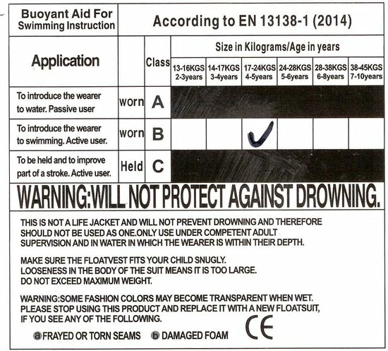 Het EasySwim Pro drijfpakje is een zwemhulpmiddel en géén reddingsmiddel. Kinderen moeten trappelen in het water om boven te blijven. Door te trappelen kan je kind drijven en spelenderwijs leren zwemmen. Indien nodig zul je je kind moeten ondersteunen, totdat hij/zij geleerd heeft om zelfstandig te blijven drijven. Blijf ook dan à ltijd binnen een armlengte van je kind!