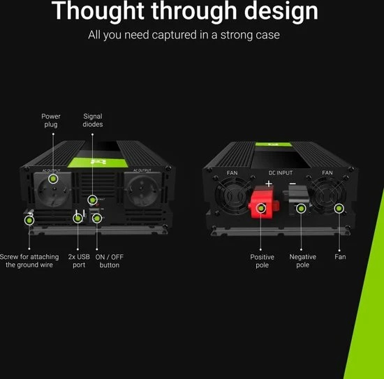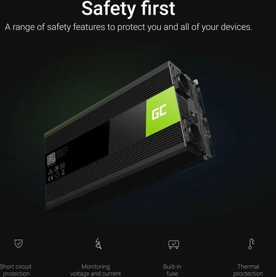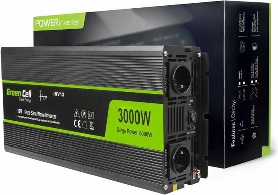 De Green Cell 3000W/6000W zuivere sinusomvormer Inverter 12V 230V voorziet uw elektrische apparaten overal en altijd van stroom. Tevens is dit de beste oplossing als u niet in de buurt van de stroombron bent. Daarnaast beschikt het over een zuivere sinusgolf die perfect werkt met apparaten die continu stroom nodig hebben, zoals bouwmachines, zonne-energiesystemen, warmtepompen en verwarmingen. Het is de beste oplossing als u niet in de buurt van de stroombron bent. Het bevat ook een USB-poort om kleinere apparaten zoals smartphones en tablets op te laden. Hij heeft stopcontacten om de elektrische apparaten veilig en snel aan te sluiten en op te laden. U hoeft zich geen zorgen te maken over overspanning, want de omvormer is uitgerust met veiligheidsvoorzieningen en veiligheidscertificaten voor een soepele werking. Het bevat ook een intelligente ventilator om de temperatuur milder te houden. Op dit product zit 24 maanden garantie.