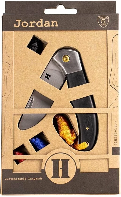 Jordan is een outdoor kinderzakmes. Aan het gekleurde keycord kan de kleine ontdekker het zakmes eenvoudig meenemen. Naast het bevestigde keycord worden er bij Jordan nog 3 keycords in andere kleuren bijgeleverd. Zo kan jouw kleine avonturier het zakmes helemaal eigen maken! Het lemmet van het kinderzakmes is gemaakt van hoge kwaliteit RVS met een mooie insparing voor de H van Homey’s. Daarbij is het heft vervaardigd uit prachtig zwart pakkahout voor een stijlvolle look en tevens extra stevigheid! Jordan wordt geleverd in een bijpassende en milieuvriendelijke verpakking gemaakt van gerecycled karton.