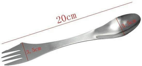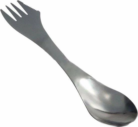 De van RVS gemaakt spork is de beste combinatie tussen een lepel, vork en mes. De zijkant van de spork kan je gebruiken om voedsel en materialen mee te snijden. De boven- en onderkant kunt u gebruiken als lepel en als vork. De spork kunt u na uw avontuur in de vaatwasser stoppen zonder schade.