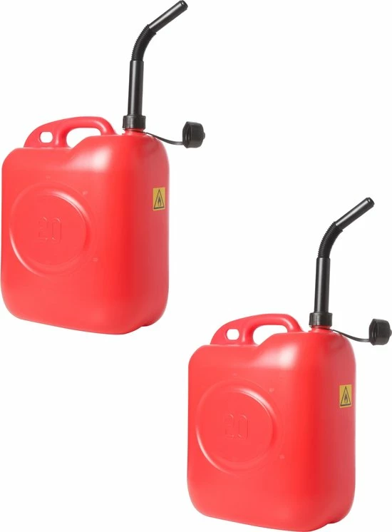 2x stuks jerrycans/benzinetanks 20 liter rood. Jerrycan, met handige anti-overlooptrechter, in de kleur rood. Geschikt voor brandstof/motorbrandstof, zoals benzine of diesel. Altijd goed reinigen alvorens u er een andere vloeistof in wenst te doen dan u eerder al heeft gedaan. Aantal jerrycans: 2x stuks. Inhoud per jerrycan: ca. 20 liter. Materiaal: kunststof. Jerrycan/watertank voor onderweg of op de camping – Brandstoffen bewaren.