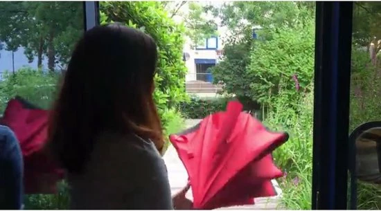 Inside Out paraplu, dubbeldoeks, windproof, zwarte stok en glasfiber frame en easy opening systeem. Het speciale ontwerp maakt het mogelijk dat deze paraplu – wanneer gesloten – volledig op zichzelf op de grond kan worden geplaatst, dus zonder enige ondersteuning en is uitgerust met een speciale C-vormige handvrije greep.