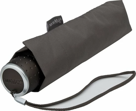 Deze opvouwbare miniMAX® paraplu is windproof, 3-delig, heeft een bijpassend gekleurd rubber gecoat handvat, en wordt geleverd met foedraal.