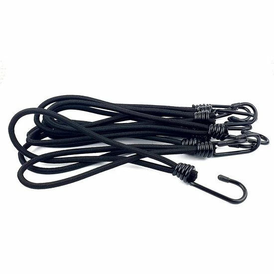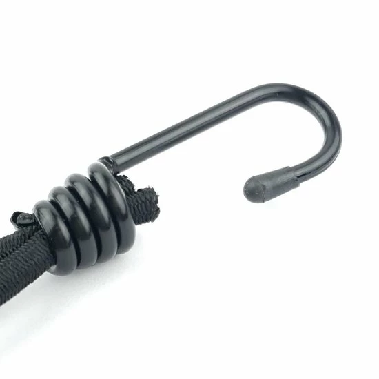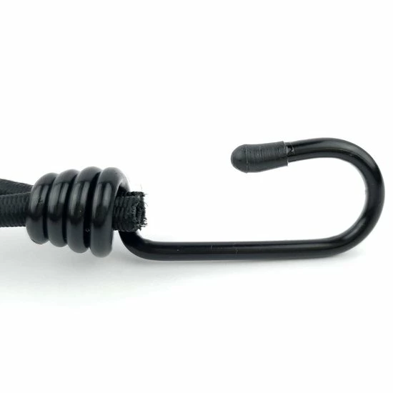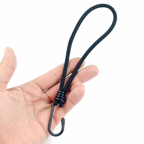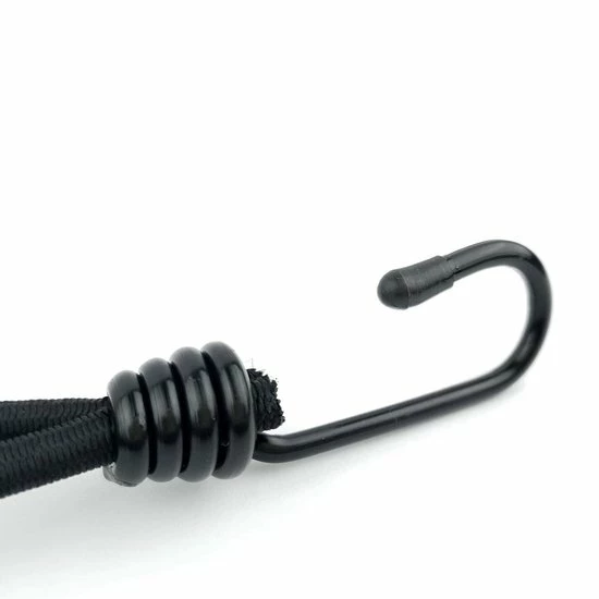 De haak en het zwart elastisch nylon koord met een diameter van 6mm is volledig weerbestendig. Door deze dikte blijft het elastiek zijn hoge rekbaarheid en sterkte houden. Zelfs in winterse temperaturen of dagenlang in de zon. Het bevestigingskoord is gemaakt van een kern van PE en een UV gestabiliseerde buitenmantel.