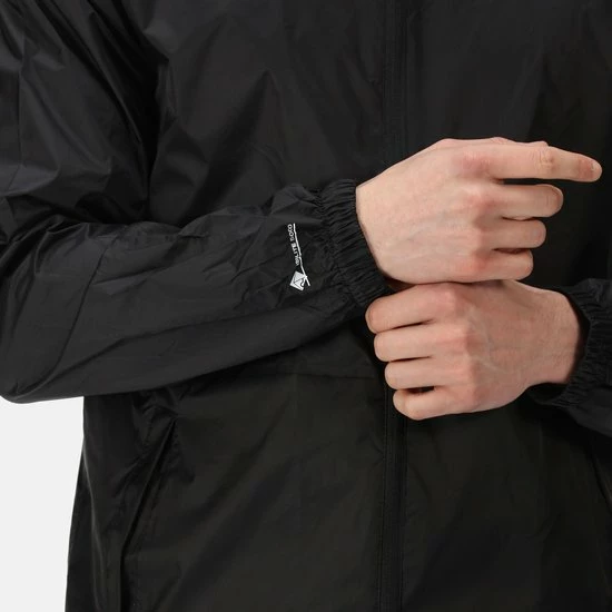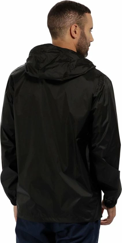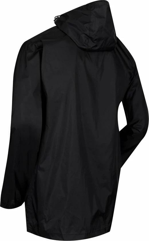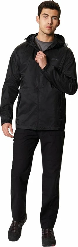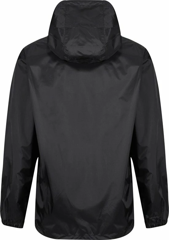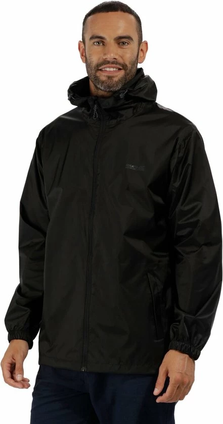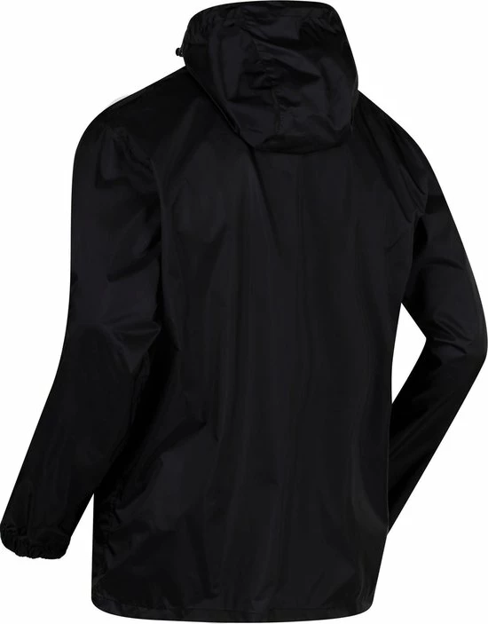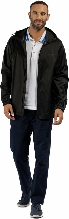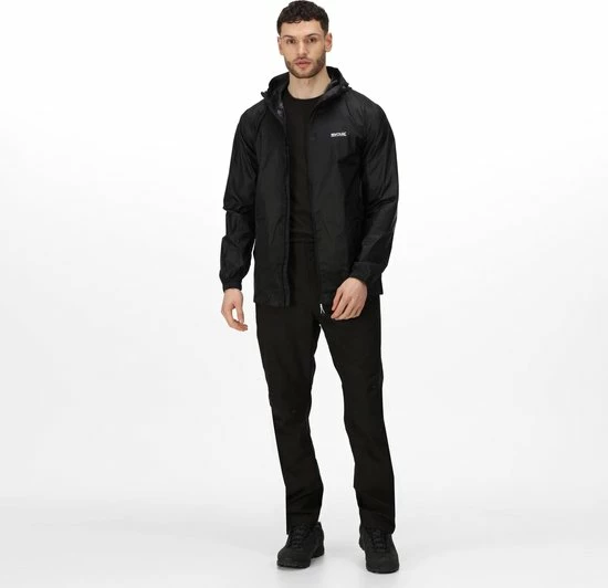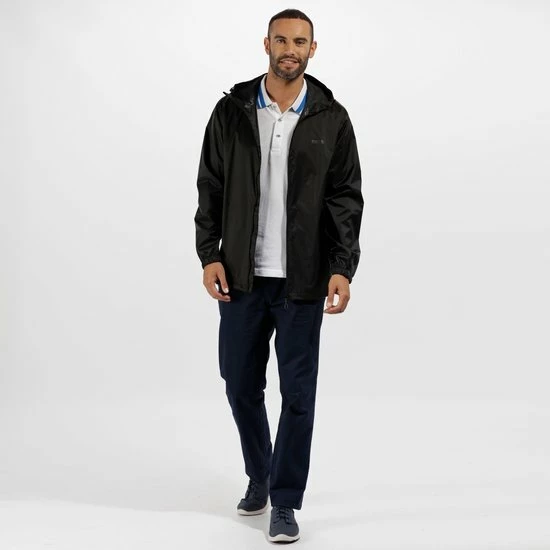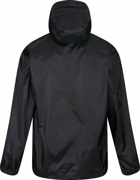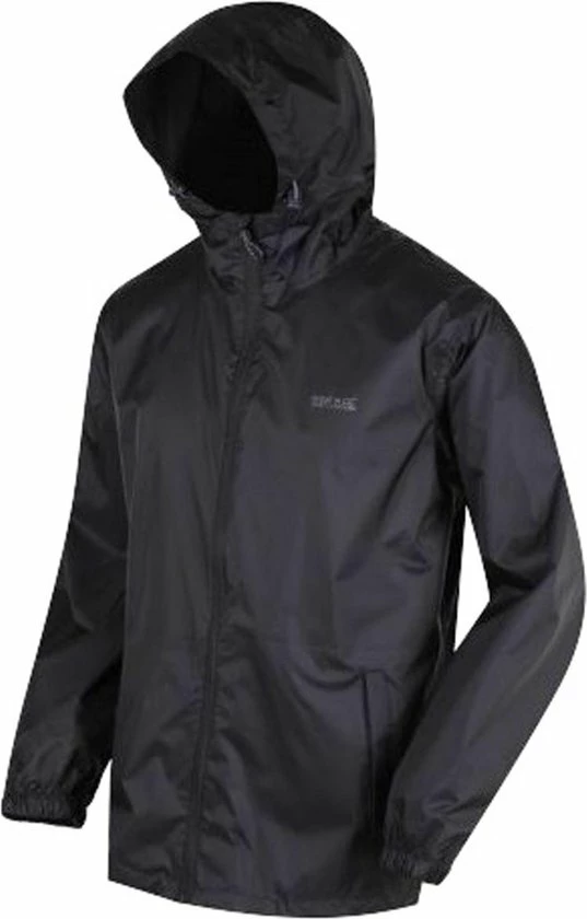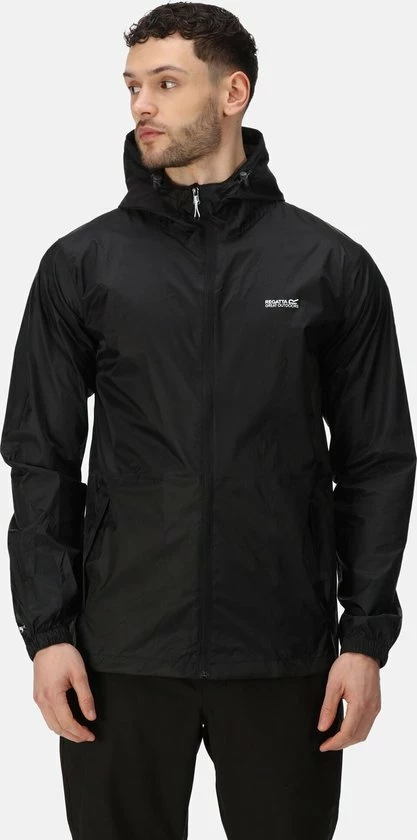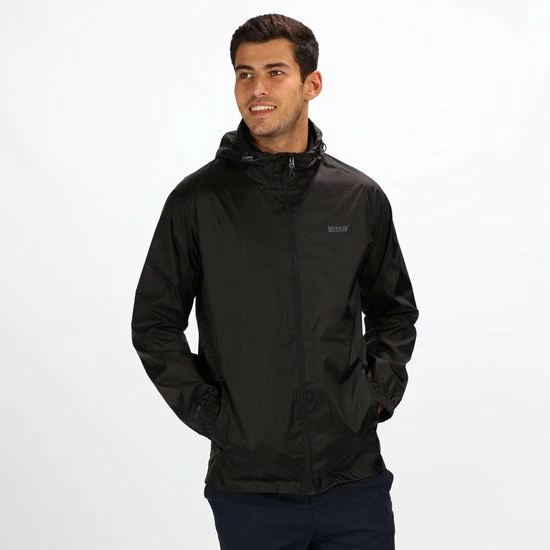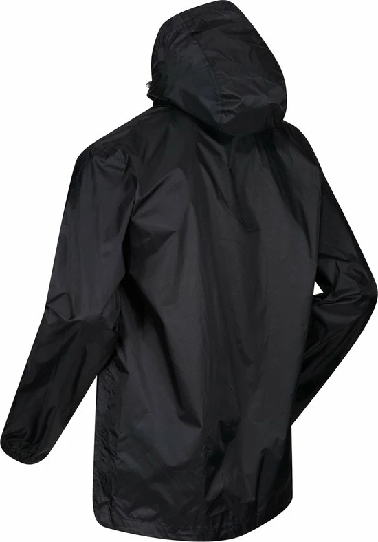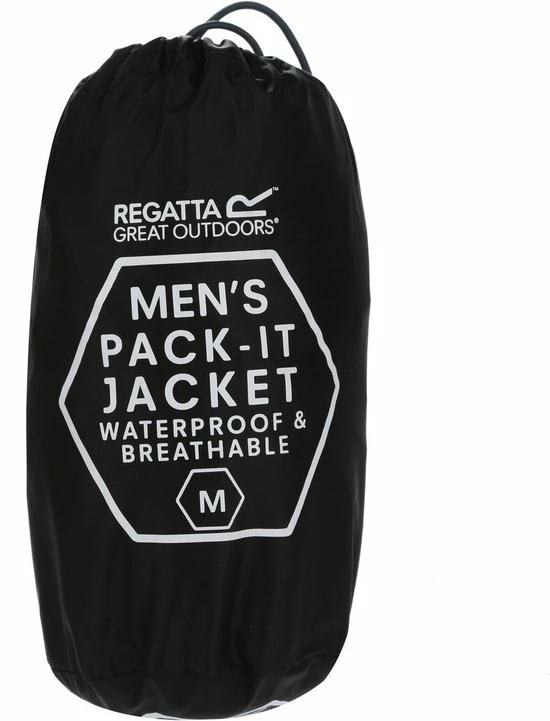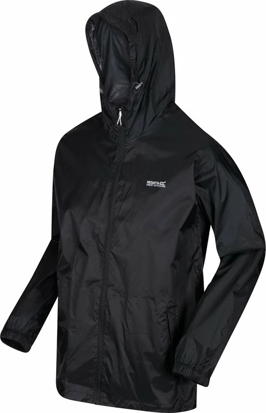 De Pack-It Jacket van Regatta voor heren is gemaakt van waterbestendige en ademende ISOLITE 5000-polyamide en heeft een verstelbare capuchon, een dunne drukknoopsluiting, twee handige zakken en een kleine draagzak. Met Regatta-opdruk op de borst.