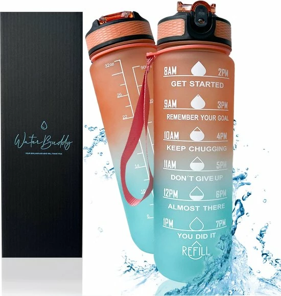 Water drinken is enorm belangrijk en gezond. Zowel je haar, nagels, huid, fysieke gemoedstoestand en algehele gezondheid heeft enorm veel baad bij voldoende vocht inname. Een gemiddeld persoon heeft per dag al zo’n 2-3 liter per dag vocht inname nodig. Dit wordt echter maar al te vaak vergeten en hier bied de Waterbuddy de oplossing! Doordat de fles 1 liter bevat en tijdsmarkeringen aangeeft, wordt je gemotiveerd voldoende te drinken en hoef je de fles maar 1-2 keer per dag bij te vullen. Wil je nog meer gemak? Wij hebben ook flesses van maar liefst 2 liter in ons assortiment!